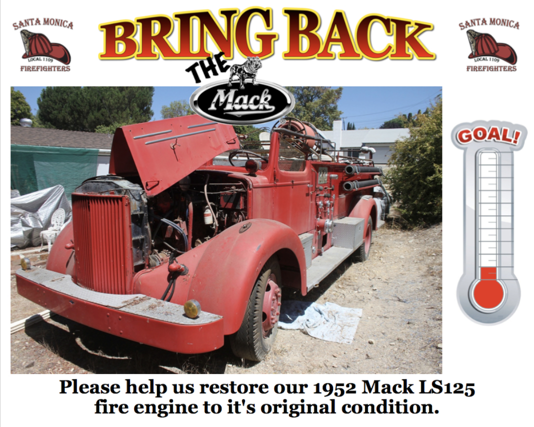 This fire engine proudly served the citizens of Santa Monica from its delivery on May 29, 1952 until it was retired in the early 1980's. It was purchased by the Santa Monica Firefighters Relief Fund and will become a showpiece for the community. Our goal is to raise money and restore it to near perfect condition. We are looking to partner with local businesses as well as citizens to help us reach our goal. Please consider making a tax-deductible donation to this worthy cause. Thank you!